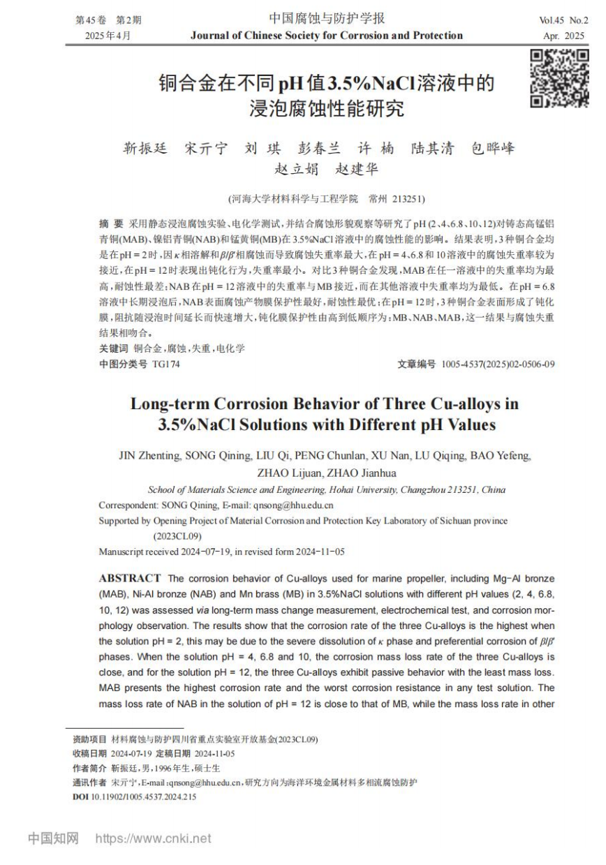 已投稿核心期刊论文1篇,目前已接收,并于2025年2月正式出版(靳振廷,宋亓宁,刘琪,彭春兰等,船舶螺旋桨用铜合金在不同pH值3.5% NaCl溶液中的浸泡腐蚀性能研究,中国腐蚀与防护学报已接收)。