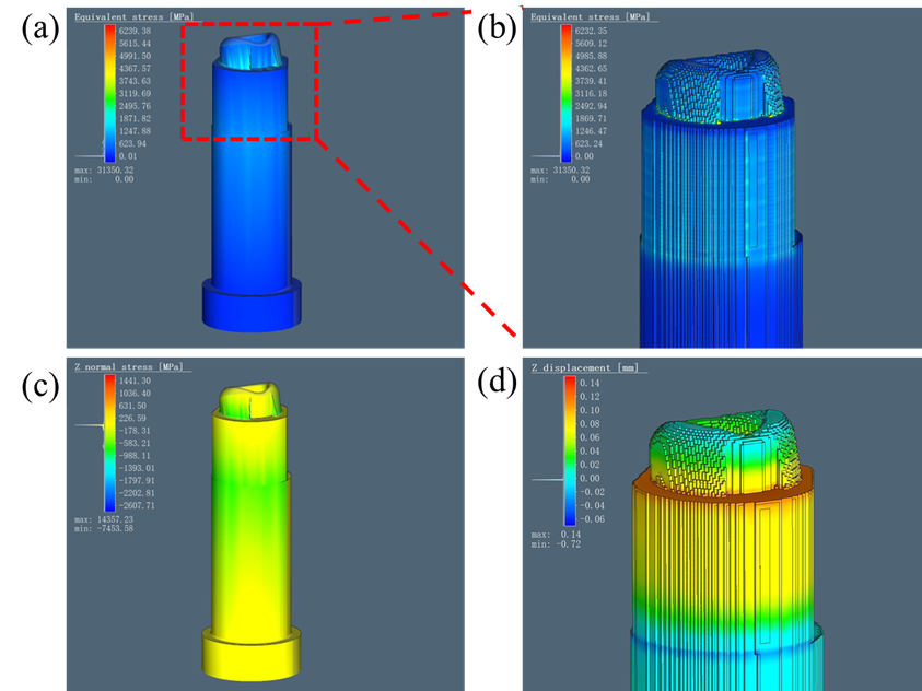 2.分析连接件应力应变和失效机理:采用有限元数值模拟方法进行 H13 钢结构件应力应变数值模拟,分别分析沉积件和锻件的应力应变,重点关注锻件和 3D 沉积件接口处在沉积过程中的应力场变化和能量密度的影响,并基于模拟结果在模具中添加圆角结构、进行预热处理,根据实验结果,以上两步骤显著减少裂纹倾向;