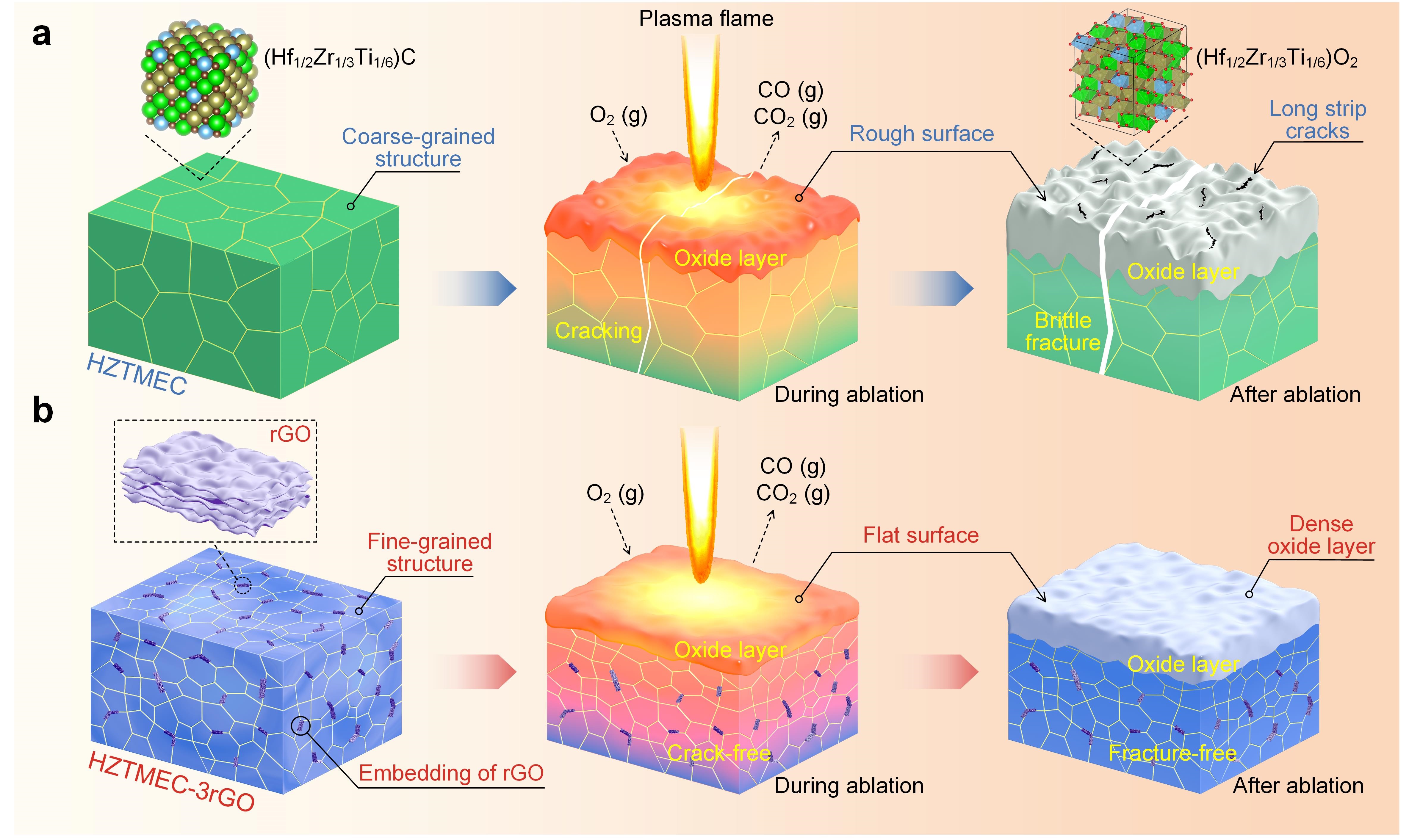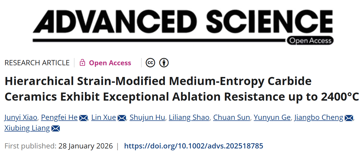 近日,我校新材料与智能制造科研团队在国际高影响力学术期刊《Advanced Science》发表题为“Hierarchical Strain-Modified Medium-Entropy Carbide Ceramics Exhibit Exceptional Ablation Resistance up to 2400 °C(分级应变调控中熵碳化物陶瓷在2400℃下展现优异抗烧蚀性能)”的研究论文。该研究在中熵(HfZrTi)C陶瓷中引入还原氧化石墨烯作为增韧相与烧蚀牺牲相,实现了跨尺度应变调控。该策略使材料在2400 ℃等离子热流冲击下保持结构完整、无宏观开裂,同时显著降低质量烧蚀率和线烧蚀率,表现出优异抗烧蚀性能,为高速飞行器热防护材料“耐高温-抗热震-抗氧化”一体化设计提供了新思路。